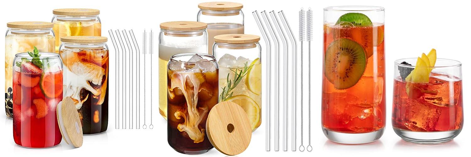Elevate your drink experience with this stylish 4-piece set of 16oz glass cups. Each set comes complete with natural bamboo lids, reusable glass straws, and two handy cleaning brushes. These tumblers are perfect for all your favorite beverages, from iced coffee and tea to smoothies and beer.